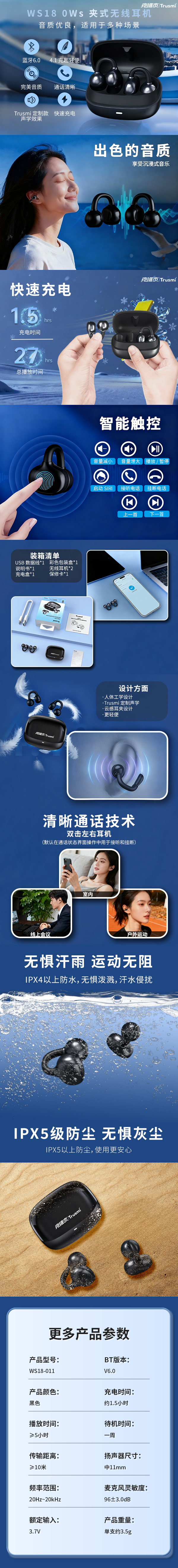 荐代发克维杰OWS夹耳式蓝牙耳机 黑色WS18-011